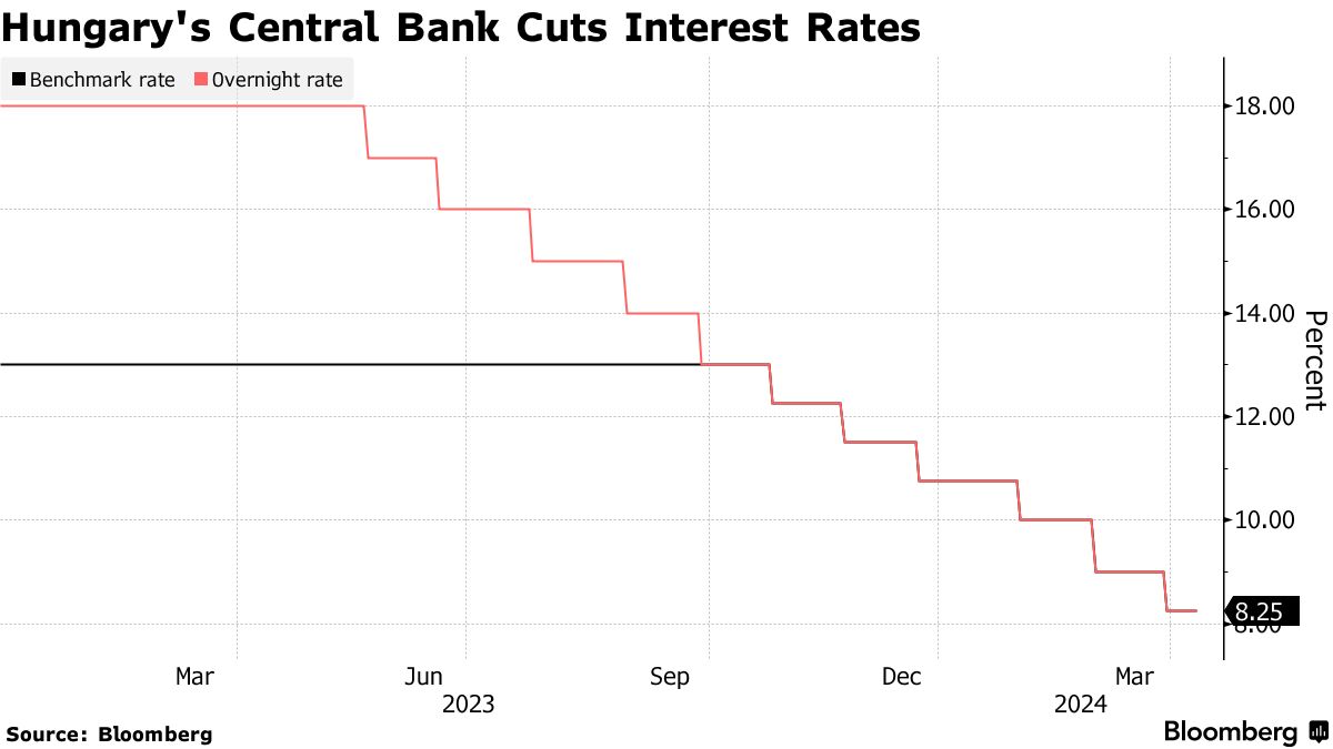 在将匈牙利国家银行的主要利率从18%的峰值降至8.25%几乎一年之后,Gyula Pleschinger在周五接受彭博采访时表示,现在是放缓的时候。他预计到6.5%至7%左右的终端利率将在6月份出现。
