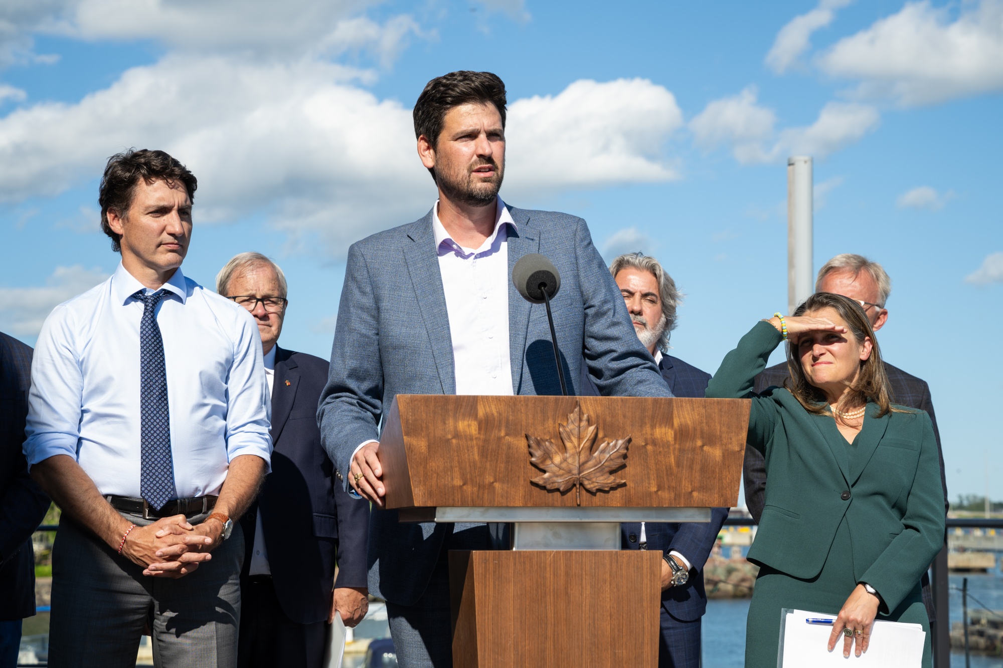 加拿大住房部长肖恩·弗雷泽(Sean Fraser),中间是总理贾斯汀·特鲁多(Justin Trudeau),副总理克里斯蒂娅·弗里兰(Chrystia Freeland)和其他政府官员。摄影师:迪恩·卡萨维奇亚(Dean Casavechia)/彭博社总理贾斯汀·特鲁多的政府将向开发商提供公共土地的低成本租赁,并推动工厂建造住房,作为其称之为“历史性”计划的一部分,以缓解加拿大的住房危机。