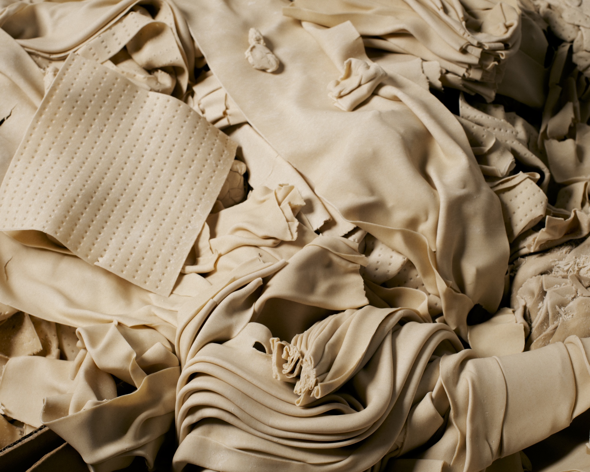 被丢弃的面团碎片。摄影师:亚当·戈尔弗,彭博商业周刊1990年,23岁的阿龙·亚戈达开始在家族马索生意中工作,他的第一个任务是接听电话和处理投诉。从那时起,阿龙·斯特赖特公司(Streit’s)发生了很多变化,尤其是公司的位置:2015年,它从曼哈顿的下东区搬到了纽约北部的一个更大的工厂。但有很多事情保持不变,包括亚戈达对回应不满顾客的承诺。“我们总是会收到来自佛罗里达某人的来信,”执行副总裁兼第四代合伙人亚戈达说。(一个经常出现的投诉是:“马索”这个词的拼写。)