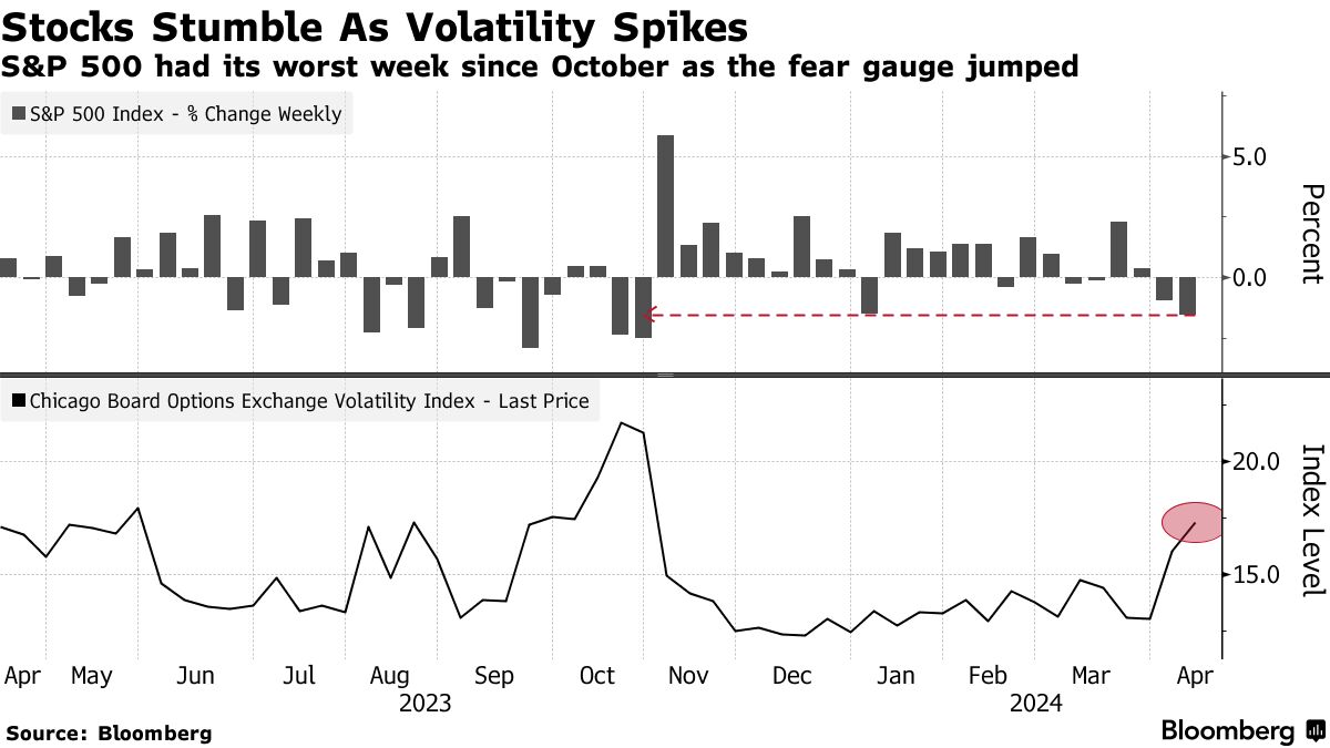 压力点之一是:以色列正准备迎接伊朗对政府目标的史无前例的袭击的消息 —— 随着股票波动在周五飙升,标普500指数迎来自十月以来最糟糕的一周,而布伦特原油收于每桶90美元以上。本周早些时候,一份高于预期的通货膨胀数据推动了10年期收益率超过4.5%,推高了美元。