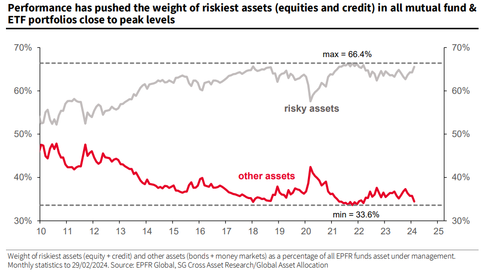 “如果对增长的信心持续下去,那么风险配置可能会保持在三分之二,但从历史上看不会再增加,”法国兴业银行美国股票策略负责人Manish Kabra说。