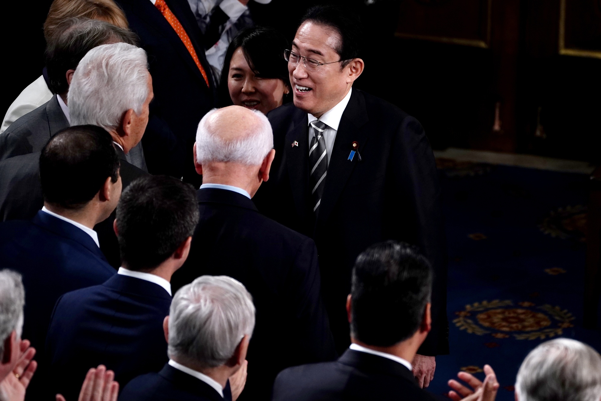 菲米奥·岸田在4月11日华盛顿美国国会联席会议期间向议员们致意。