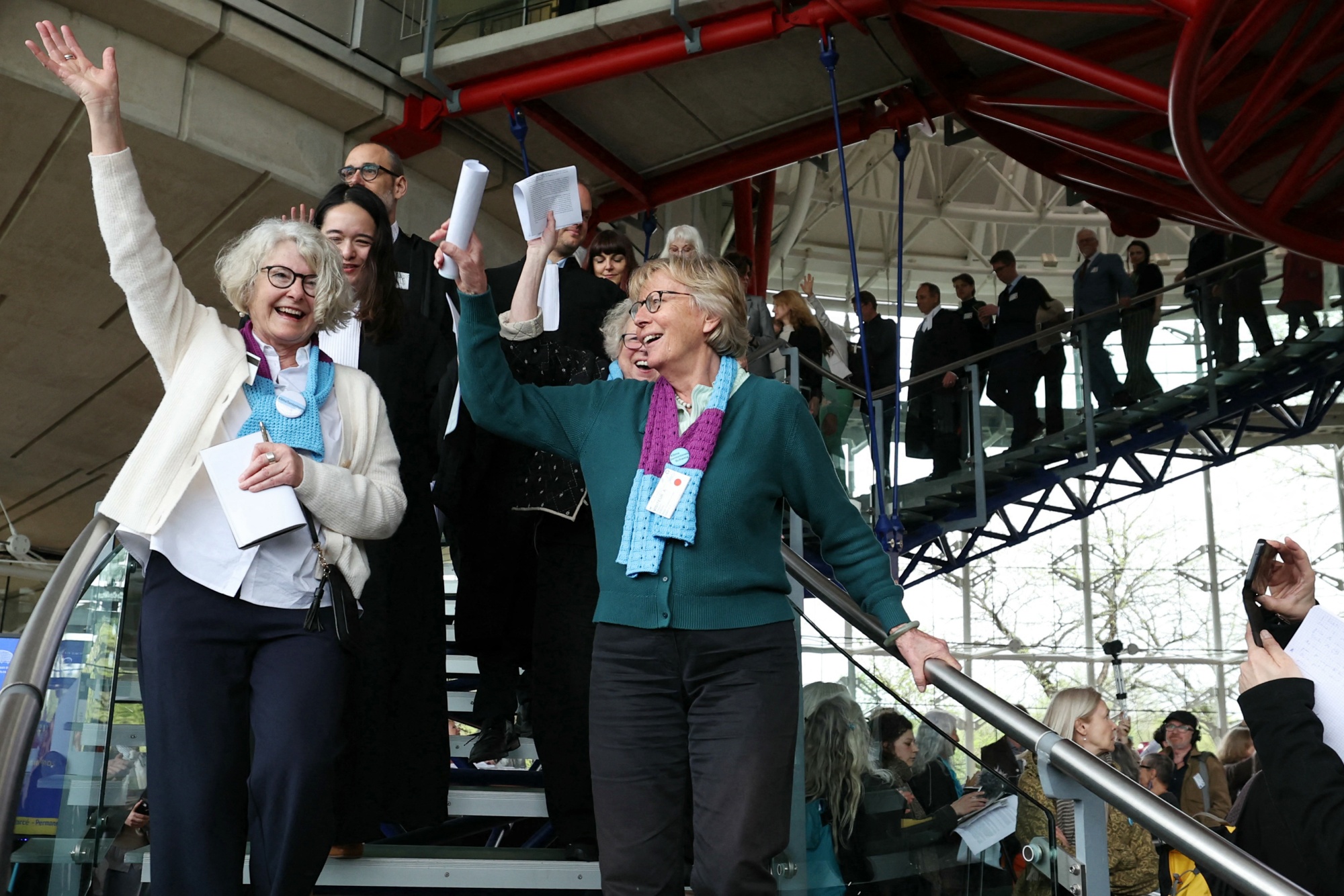 成员KlimaSeniorinnen Schweiz(瑞士气候保护老年妇女)在4月9日斯特拉斯堡的欧洲人权法院外等待判决。