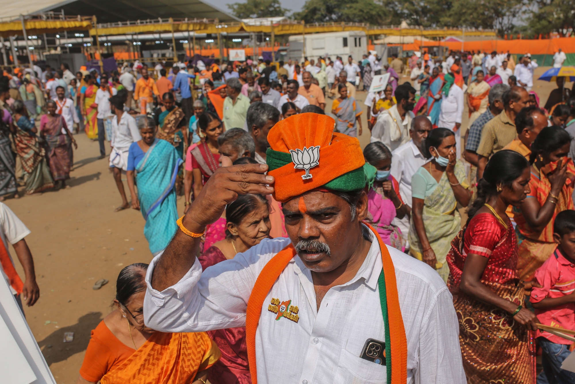 出席者在4月10日的活动中与印度总理纳伦德拉·莫迪在泰米尔纳德邦的哥印拜陀举行竞选集会。