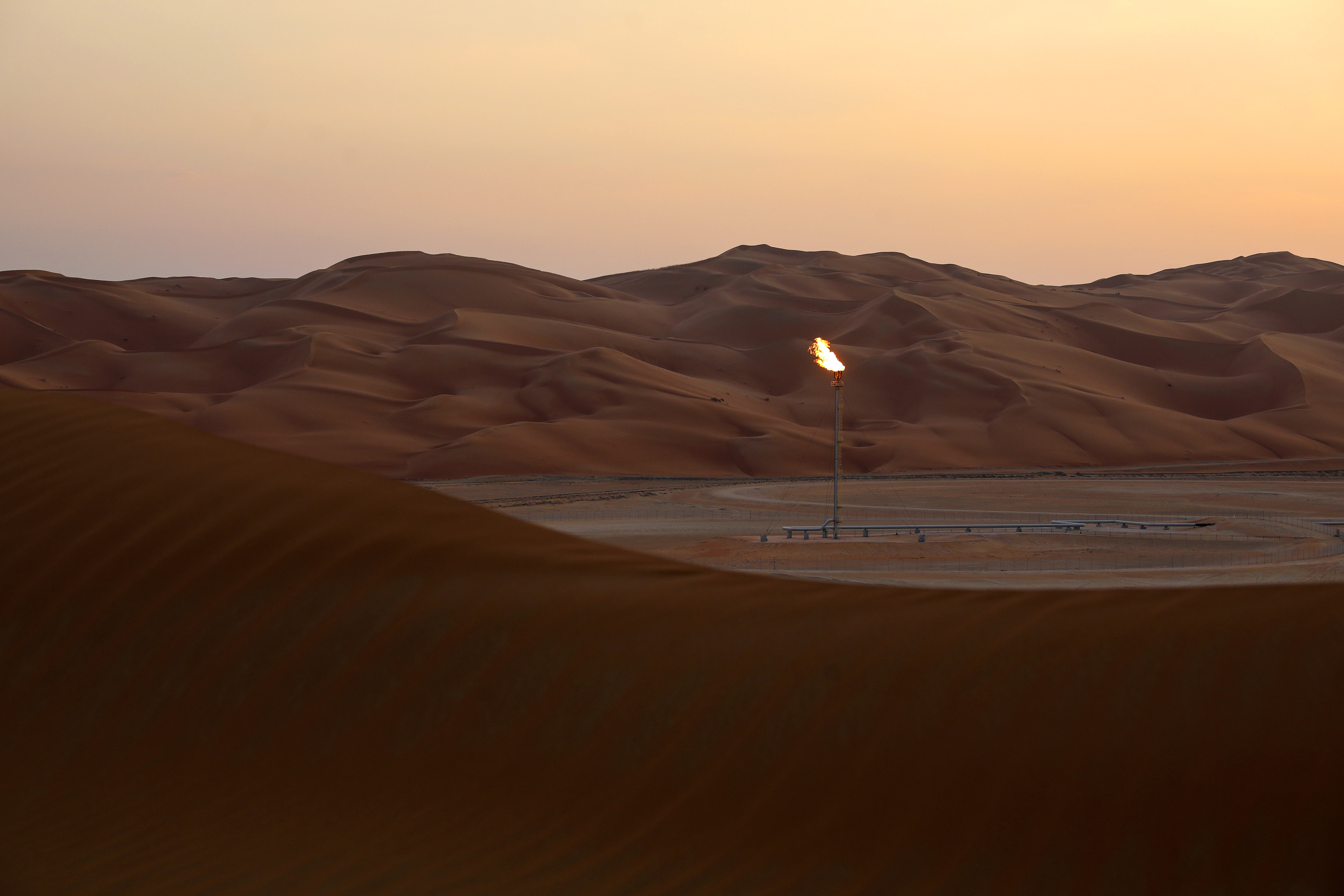 火焰在沙特阿拉伯沙伯油田的炼油设施燃烧。
