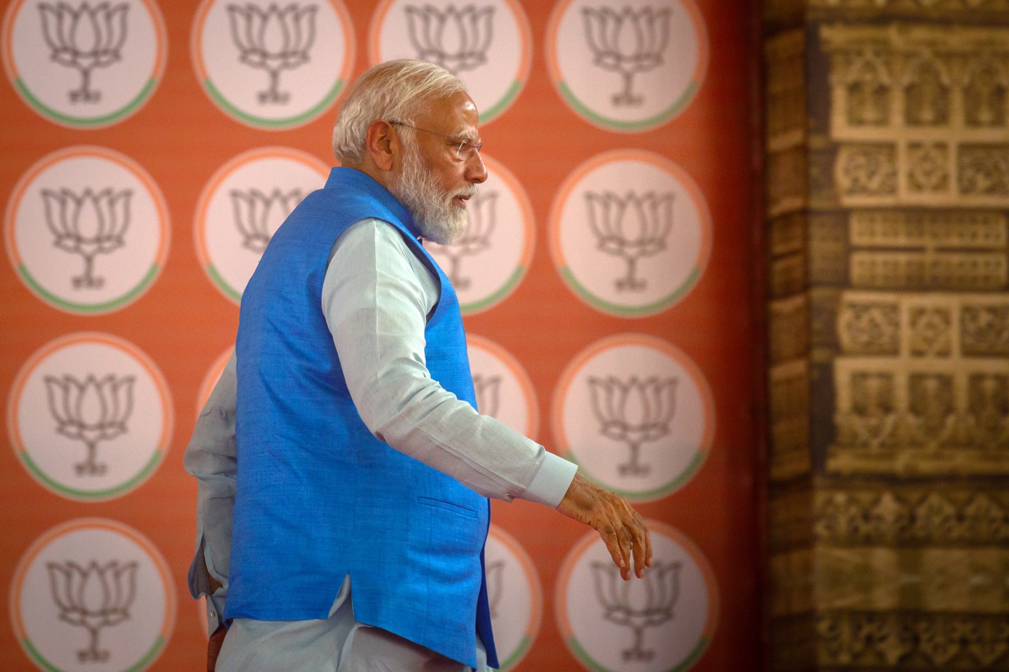 纳伦德拉·莫迪摄影师:阿比舍克·钦纳帕/盖蒂图片社印度执政党将总理纳伦德拉·莫迪置于其竞选宣言的中心,强调他在兑现承诺方面的记录,承诺促进经济增长。