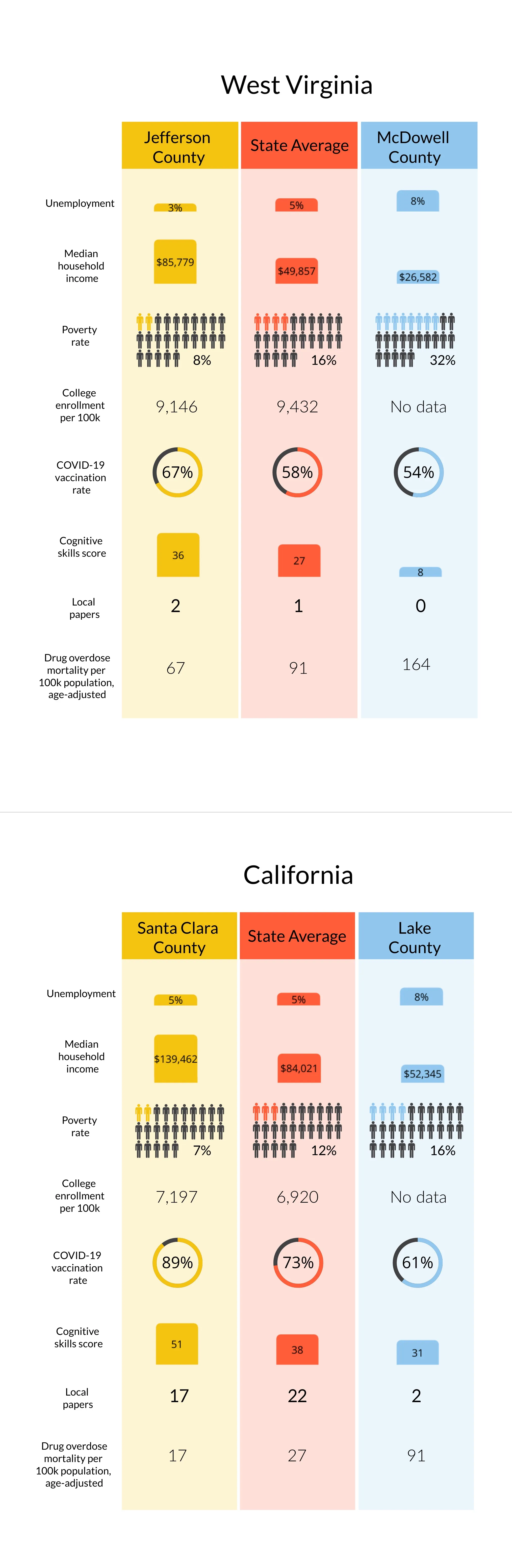 西弗吉尼亚州的杰斐逊县和加利福尼亚州的圣克拉拉都是繁荣的地区,拥有多种教育机会、高水平的高级认知技能、低贫困率和多家地方报纸。它们的Covid疫苗接种率均高于州平均水平。