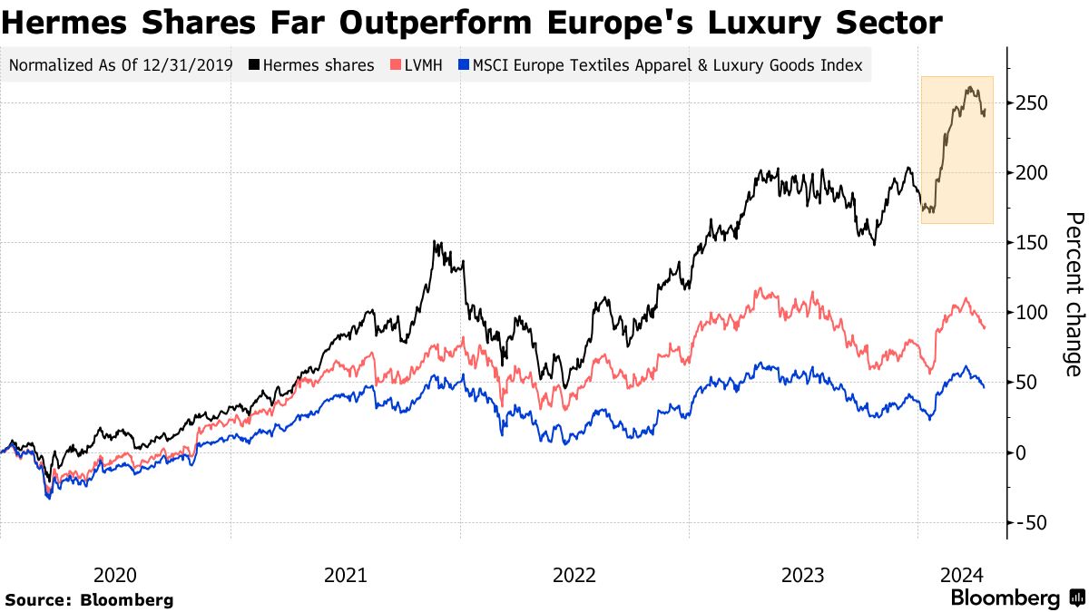 尽管在疫情后繁荣之后对高端商品需求放缓的担忧有所增加,爱马仕的股票今年迄今已上涨20%,表现优于其他奢侈品股票。一个 指标跟踪该行业在同一时期仅上涨6.8%,而LVMH上涨了8.2%。