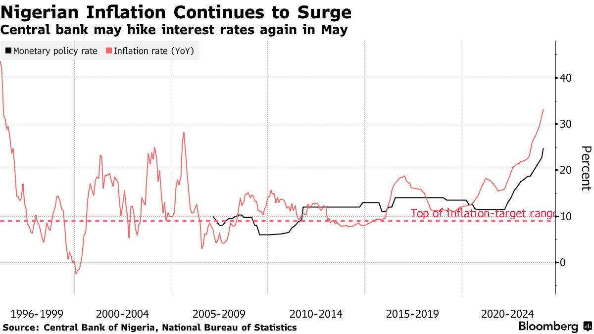 州长奥拉耶米·卡多索及其委员会成员现在必须在5月20日至21日的政策会议上评估两者对通货膨胀的影响,该会议在博拉·蒂努布总统上任一周年前一周举行。另一次利率上调,虽然预期,可能会引发批评。尼日利亚制造业协会上个月抱怨说,借贷成本的上升“减少了资金的获取、制造投资和竞争力。”