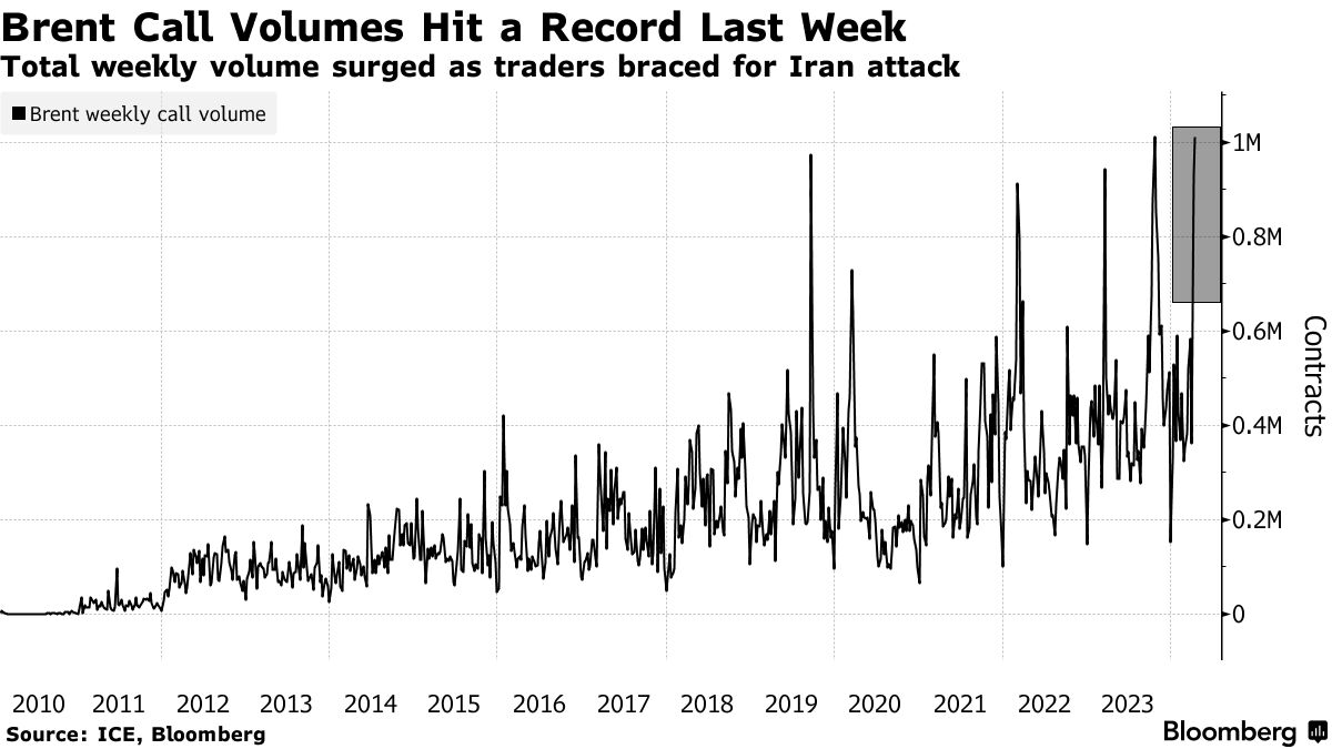 交易者们纷纷涌向石油期权市场,以对冲如果以色列和伊朗之间的冲突进一步升级,价格上涨的风险。期权通常用于保护主要地缘政治风险,因为它们提供了一种更便宜的方式来从价格飙升中获利。