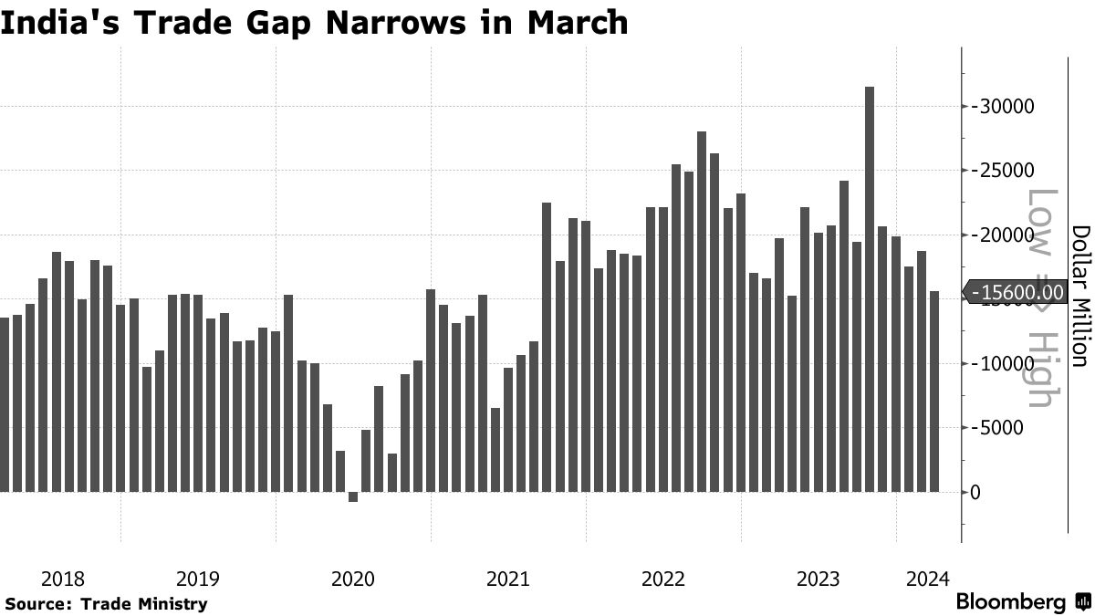 印度的贸易逆差在三月份缩小至11个月来的最低水平 - 彭博社