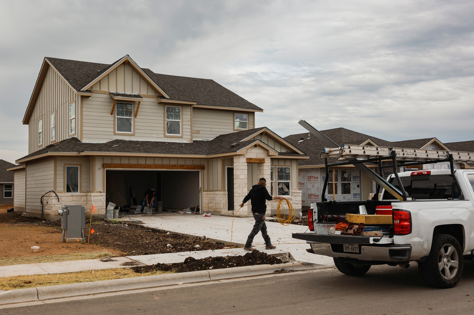 得克萨斯州凯尔市一座正在建设中的住宅前的工人。