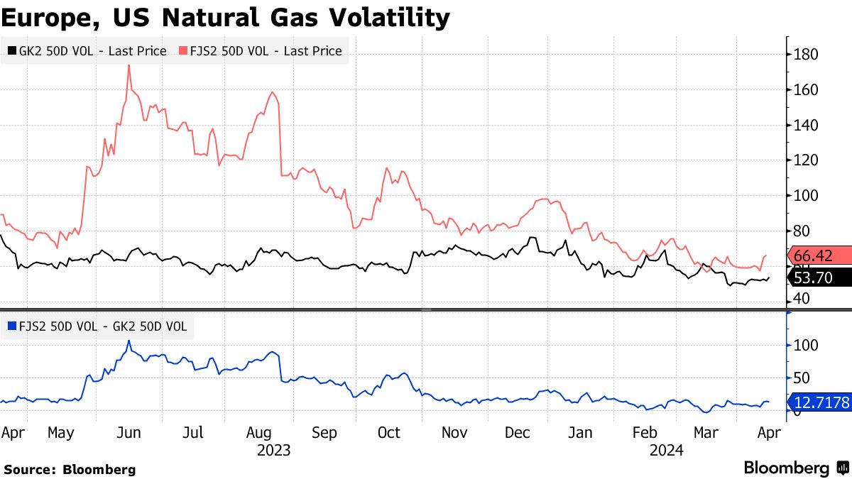 * 美国和欧洲天然气隐含波动率保持稳定,尽管由于更广泛的中东冲突带来的供应风险,欧洲市场略微上涨。美国市场仍处于低迷状态,一些盆地的现货价格跌至零以下,生产商在抑制产量。