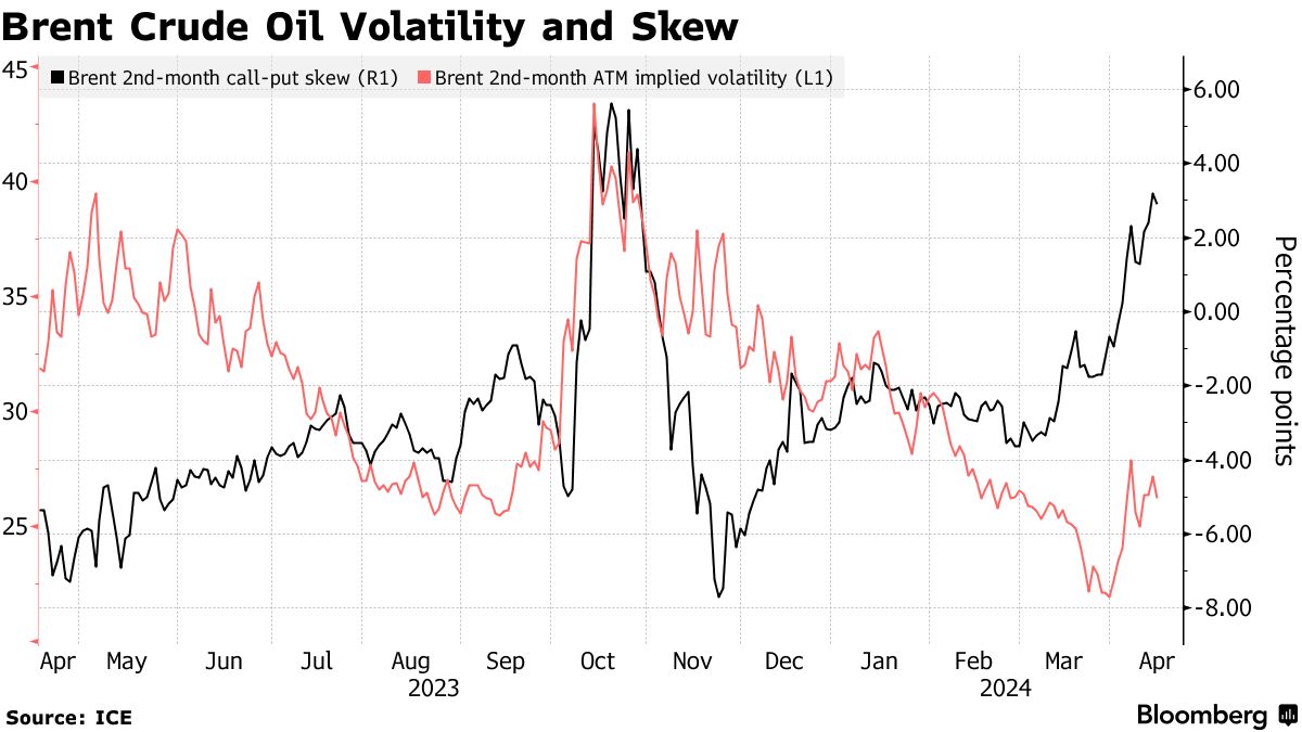 在商品市场,由于伊朗和以色列之间的冲突,本月石油期权从看跌转为看涨溢价,这是自去年十一月以来首次,而OPEC+的减产措施将布伦特原油推高至每桶90美元以上。上周布伦特看涨期权交易数量创下 历史新高,市场在周末伊朗袭击之前处于紧张状态,并且周一的交易速度创下了每日纪录。看涨期权的溢价升至去年十月以来的最高水平,在以色列没有立即报复后,周一早些时候有所回落。