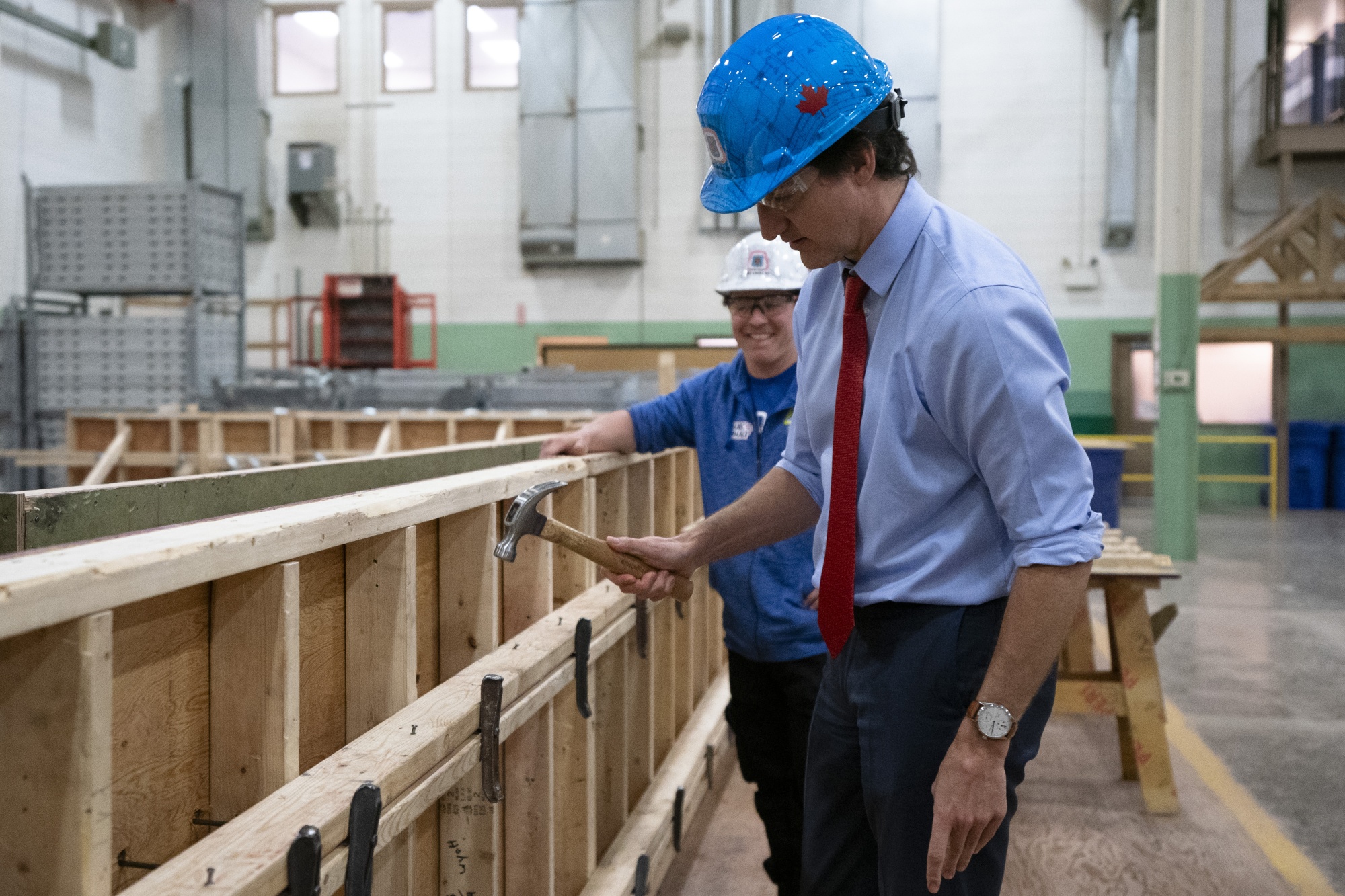 加拿大总理贾斯汀·特鲁多于4月12日星期五在安大略省伍德布里奇的木工和相关行业培训中心。