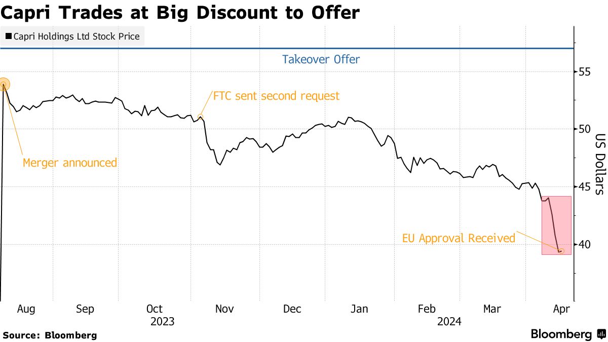 过去四个交易日,Capri的股价下跌了近11%,跌至约39美元,这是基于上周美国联邦贸易委员会官员对他们如何定义市场份额发表的负面评论。这导致Capri的交易价格与Tapestry每股57美元的收购要约之间的差距大约为18美元,几乎是自八月份宣布合并以来的最大差距。一周前,这个差距是13美元。