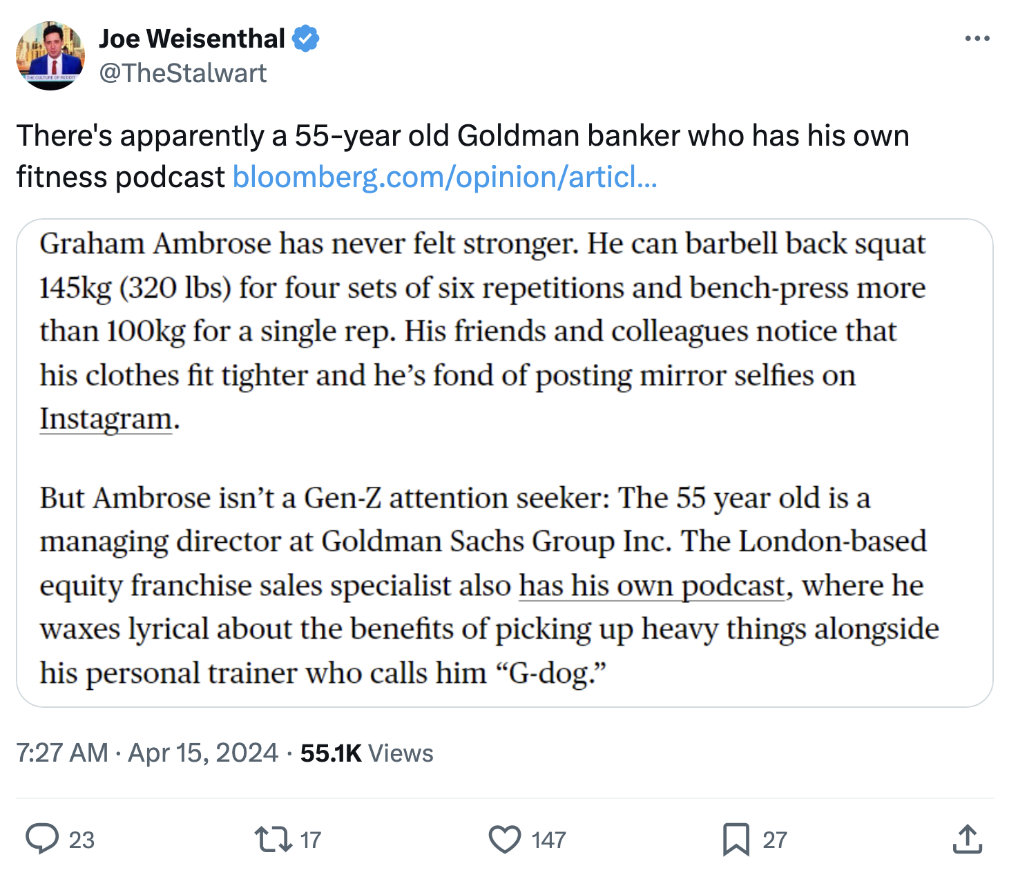 “那些一生都在努力管理风险以换取长期财务收益的人往往未能将这些教训应用到自己的健康上,” Chris写道。但越来越多的人似乎开始意识到运动可以带来深远的回报。在与高盛银行家格雷厄姆·安布罗斯(Graham Ambrose)进行的Zoom会议中,Chris得知“最近在高盛健身房很难找到一个空的深蹲架。”