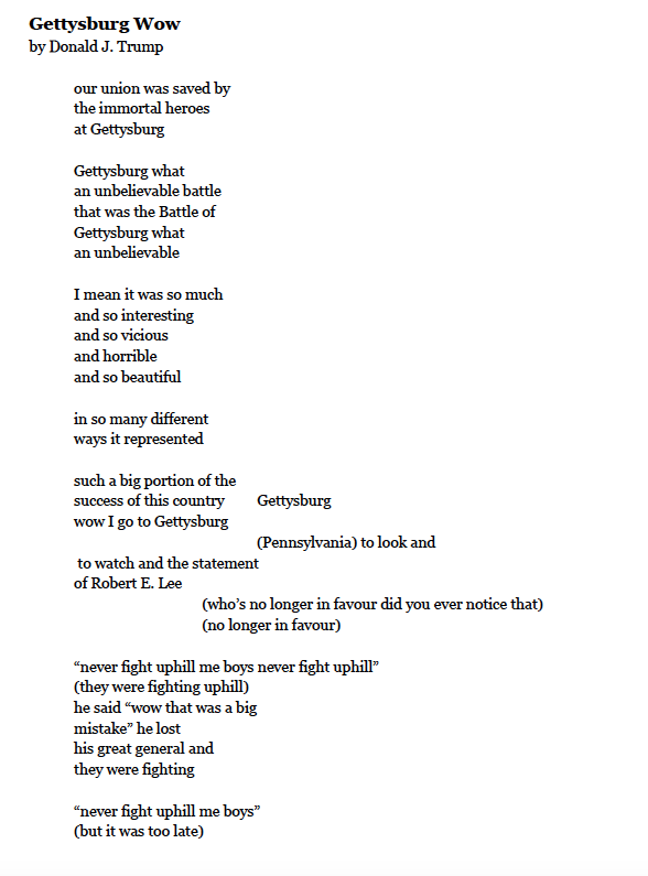 我们会对唐纳德·特朗普在宾夕法尼亚州的集会上出丑感到惊讶吗?不。但他关于葛底斯堡“难以置信的战斗”的神秘词汇沙拉是如此难以理解,以至于一位X上的英语教授将其转化为一首诗。他不是鲁皮·考尔,但看到他的胡言乱语像这样排列和韵律化,确实令人满足: