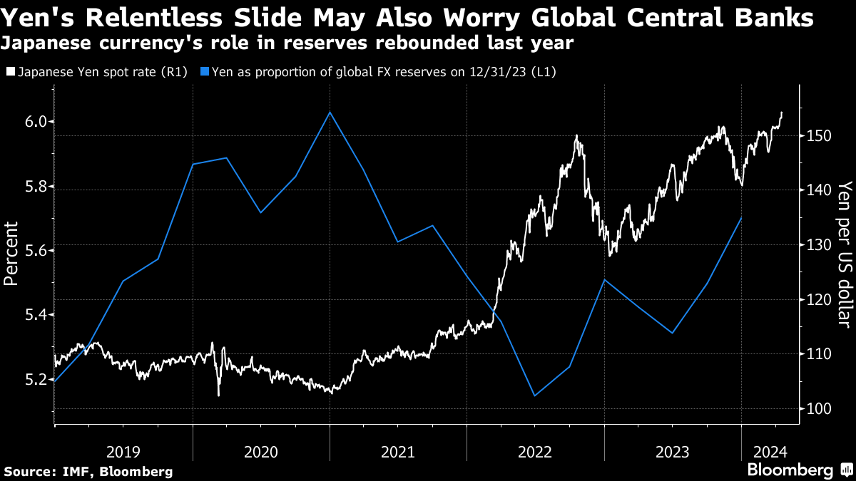 日元的贬值也可能引起日本以外的央行的担忧,考虑到自2022年以来他们增加了该货币在外汇储备中的比重。可能有一些储备管理者后悔了这一举措,他们从2022年9月30日至去年年底增加了约930亿美元的日元。尽管日元仍然是全球储备的第三大比例,但其在货币中所占比例的5.7%远远落后于占比20%的欧元和占比58%的美元。