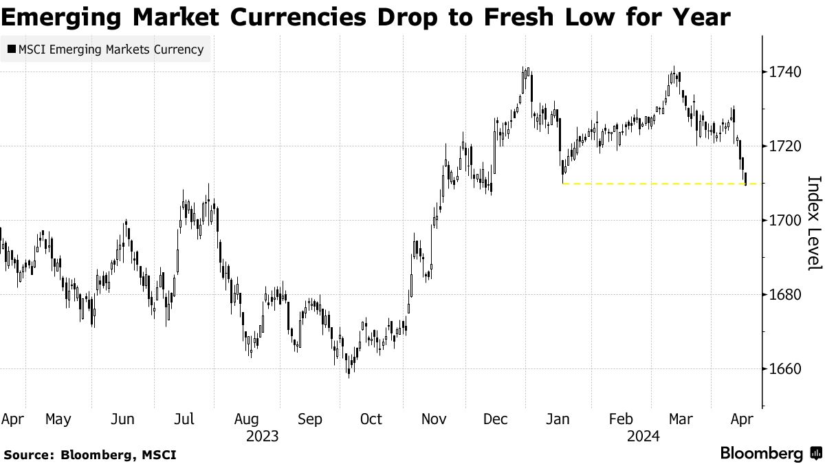 新台币贬值至2016年以来的最低点,而 菲律宾比索 首次贬值至每美元57比索,这是自2022年11月以来的首次。MSCI新兴市场货币指数今年下跌了1.8%。