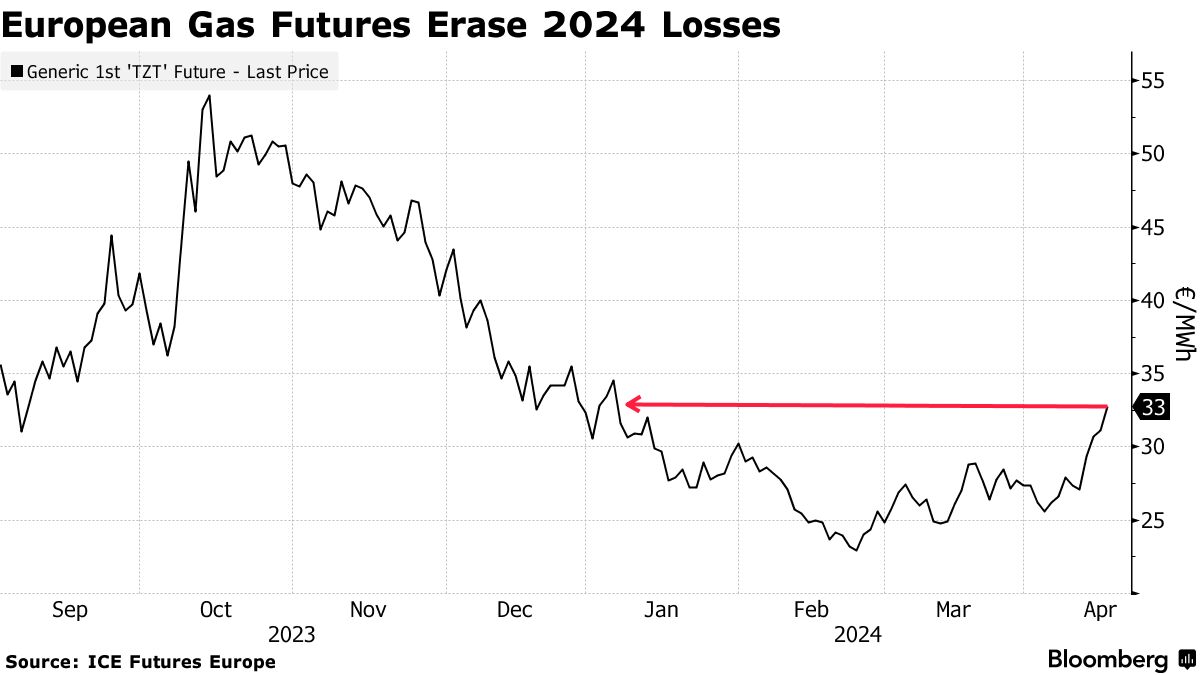 基准期货周二上涨多达6.6%,连续第四天上涨。本月不断升级的地缘政治风险迫使交易员重新评估他们对欧洲能源供应的乐观态度,俄罗斯对乌克兰的打击以及中东最新的紧张局势凸显了全球贸易流动的脆弱性。能源基础设施,自年初以来曾一度失去约30%的价值,异常温暖的冬季压制了天然气需求,但现在已完全抵消了2024年的跌幅。