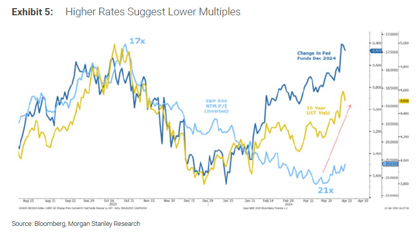 为什么利率对人们愿意为股票支付的估值没有更多影响?摩根士丹利的美国股票策略师迈克·威尔逊(Mike Wilson)提供以下图表,展示了股票估值与收益率以及预期联邦基金利率之间的关系如何发生了变化。去年,随着利率上升,股票的估值倍数下降,正如理论所预示的那样。现在,尽管收益率大幅上升,股票的估值倍数几乎没有变化: