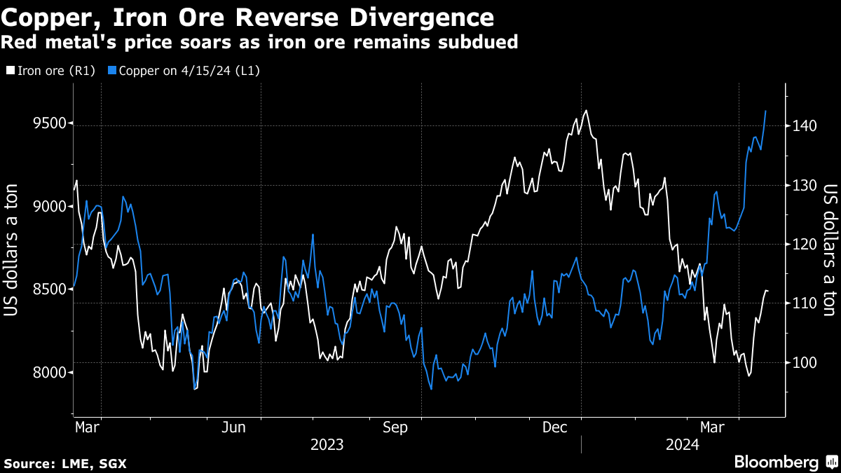 中国仍然是铜的最大消费国。铁矿石是炼钢的主要原料,另一种金属,其价格几乎完全由中国对一代人的需求推动,4月初跌至约一年来的最低点,然后回吐了部分损失。自中国复苏乐观情绪达到顶峰以来,铁矿石跌幅超过20%。在这种分歧下,两种金属必定存在一些不同的因素在起作用: