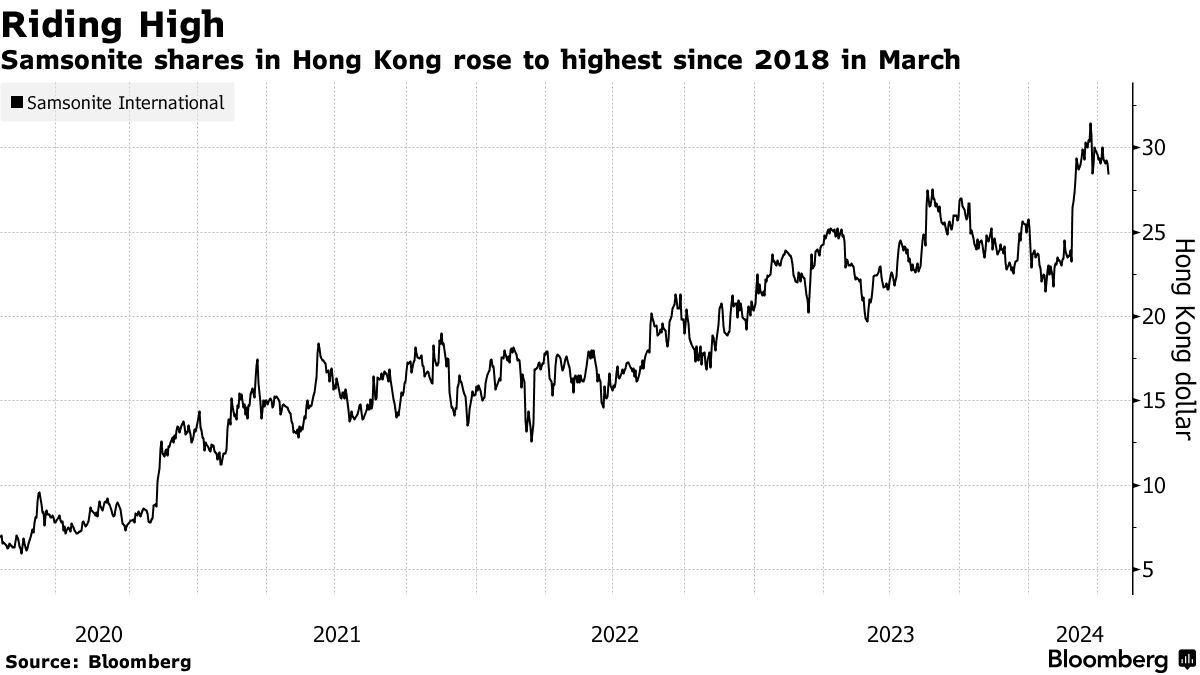彭博社报道称,周二有关收购兴趣减弱的消息传出后,Samsonite的股价进一步下跌,最多下降了5.3%,创下自3月22日以来的最大跌幅。该股票的12个月涨幅收窄至11%,使Samsonite的市值约为410亿港元(52亿美元)。