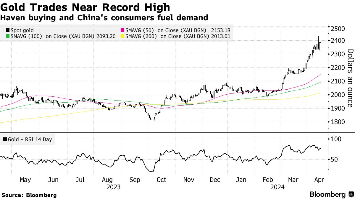 黄金一直在飙升,受到中东和乌克兰的战争、中央银行的购买以及中国消费者需求的推动。高盛集团表示,这种贵金属处于“不可动摇的牛市”,并将年底预测提高至2700美元。瑞银集团则预计年底将达到2500美元。