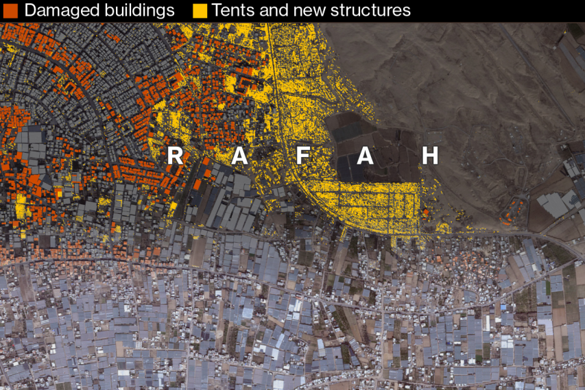 帐篷和新结构,来自彭博分析的卫星图像;受损建筑,来自CUNY研究生院的Corey Scher和俄勒冈州立大学的Jamon Van Den Hoek的Copernicus Sentinel-1卫星数据分析,截至2024年3月29日;卫星图像来自Planet Labs PBC;建筑轮廓来自Microsoft Buildings和OpenStreetMap。来源:彭博社现在有超过一百万流离失所的人居住在加沙南部城市拉法,这也是以色列在消灭哈马斯领导层的行动中的最后一个主要军事目标,哈马斯是伊朗支持的激进组织。利用卫星分析来识别受损建筑和难民帐篷,以下是六个月战争后拉法地区的情况。