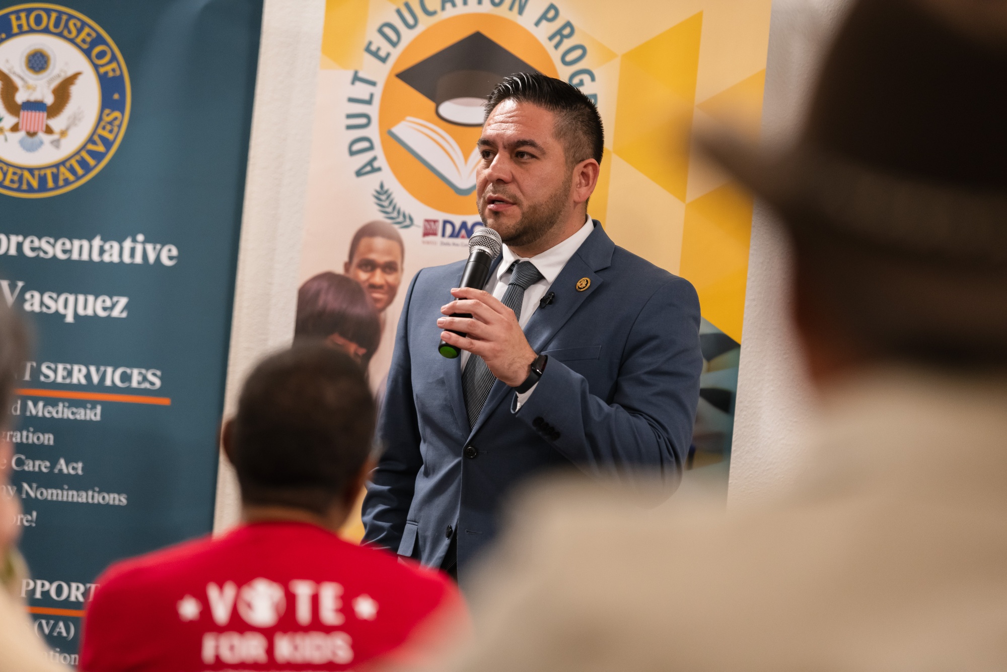 代表加布·瓦斯奎兹在新墨西哥州Sunland Park的一次市政厅会议上讲话,日期为2月21日。摄影师:贾斯汀·哈梅尔/彭博社### 民主党新人