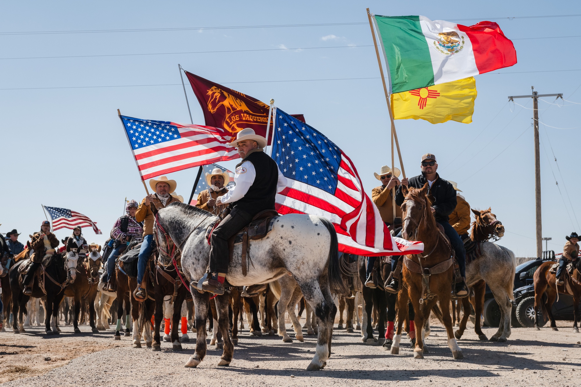 美国骑马者与墨西哥骑手一起参加3月9日在新墨西哥州哥伦布举行的“友谊骑行”活动。摄影师:Justin Hamel/Bloomberg这场激烈竞选的戏剧性增加了其地理位置的影响:它与墨西哥有着180英里的边界,使其成为2024年选举中最具争议的问题的中心。