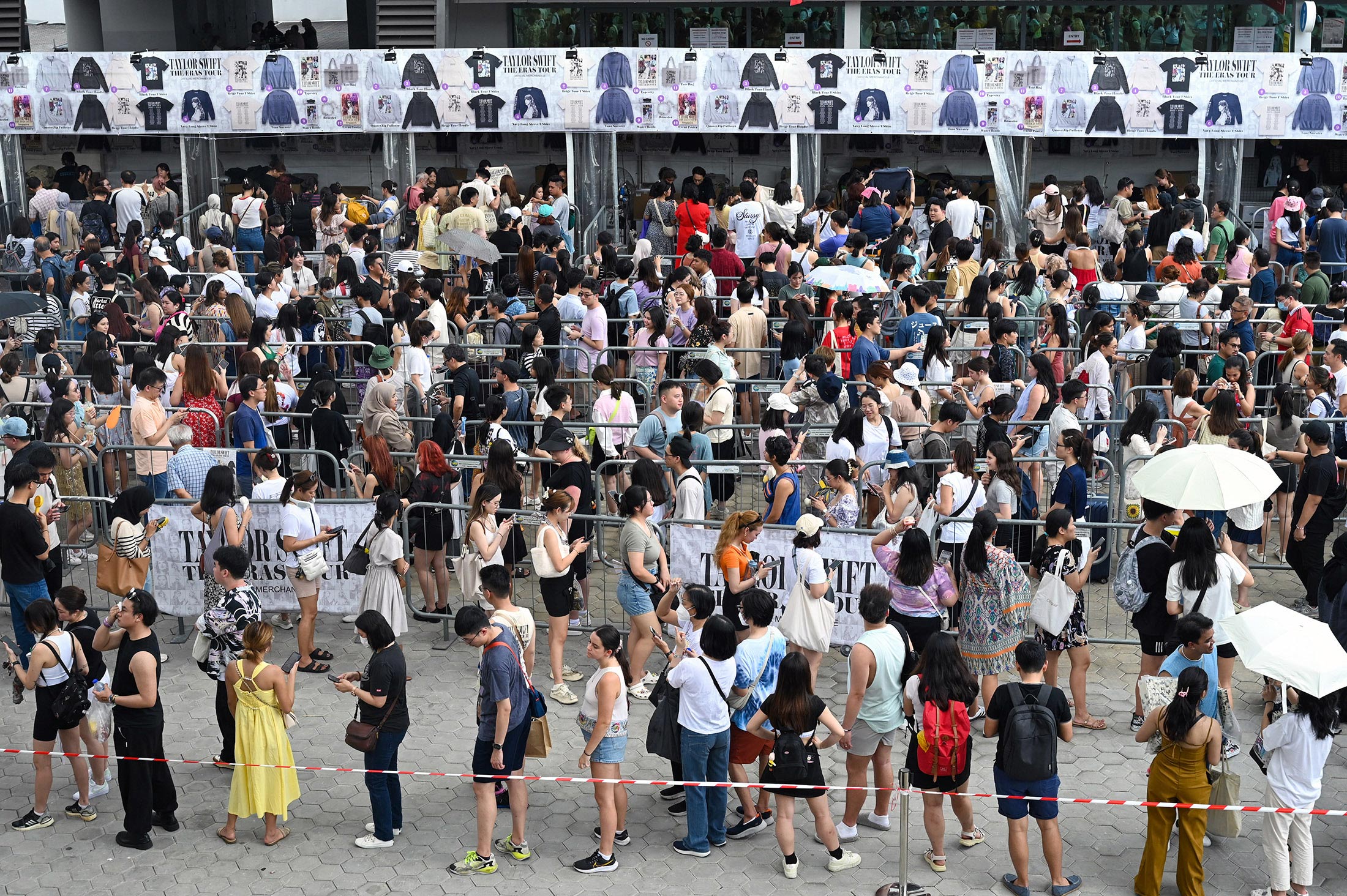 Swifties在新加坡上个月的Eras Tour演唱会上排队购买商品。摄影师:Roslan Rahman/AFP/Getty Images26岁的麦迪·布莱恩在洛杉矶从事时尚营销工作,观看了五场Eras Tour演唱会。她收集了一系列官方和非官方商品,包括三件开衫、节日装饰品和睡衣。当她想要找到某句歌词或主题启发的东西,或者需要快速获得某物时,布莱恩会选择非官方渠道。作为奖励,这通常比斯威夫特的网站便宜。