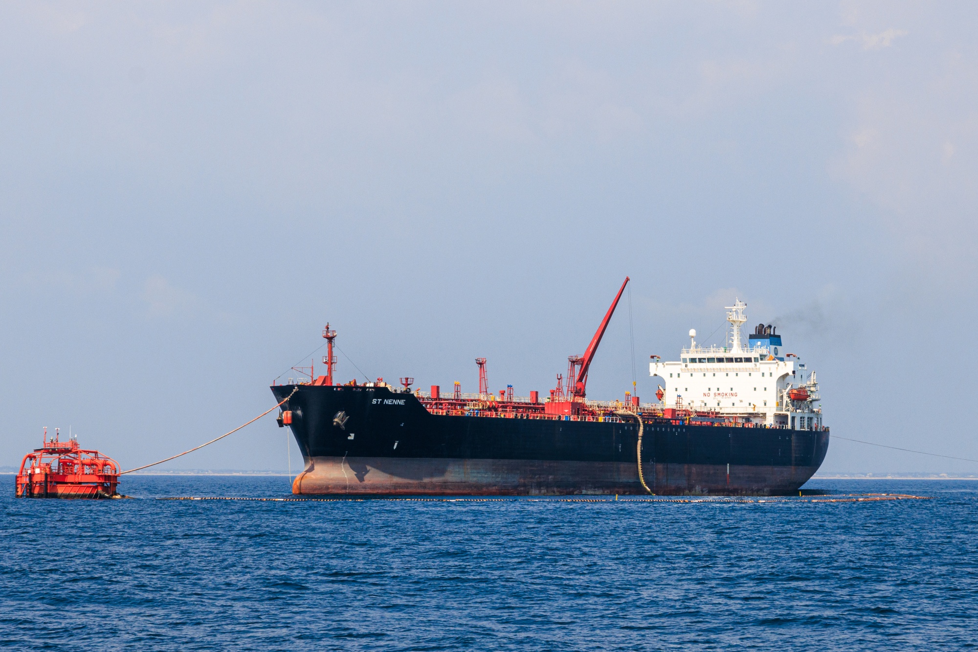 一艘油轮在尼日利亚商业中心拉各斯近海处卸载原油。