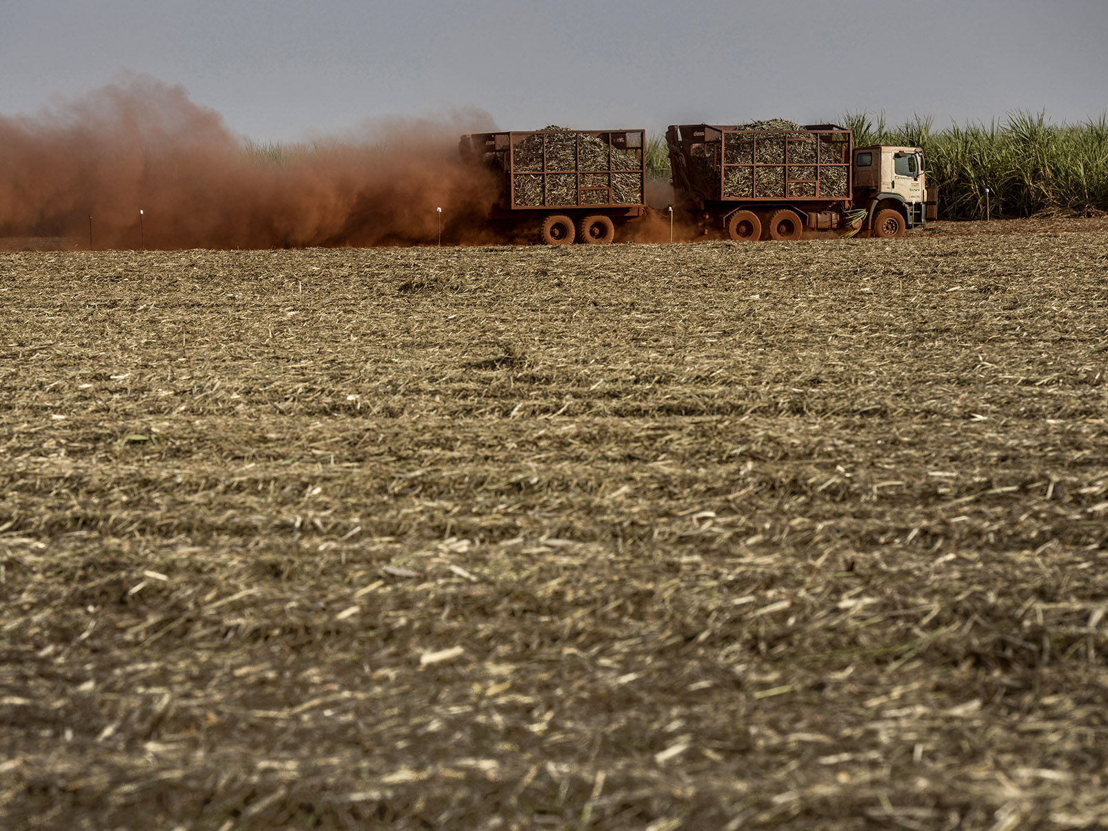 一辆装满甘蔗的卡车驶过巴西Sertaozinho的一个农场收割的田地。来源:彭博社