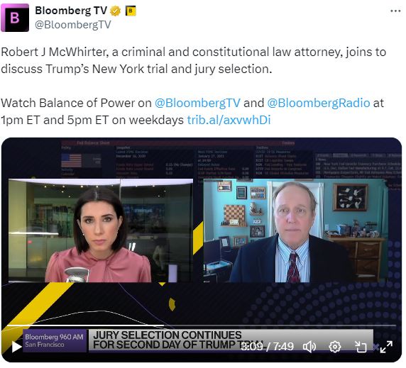 今天在彭博电视台的权力平衡早间版节目中,主持人乔·马修和凯莉·莱因兹采访了罗伯特·J·麦奎特,一位刑事和宪法律师,谈论特朗普在纽约的审判。