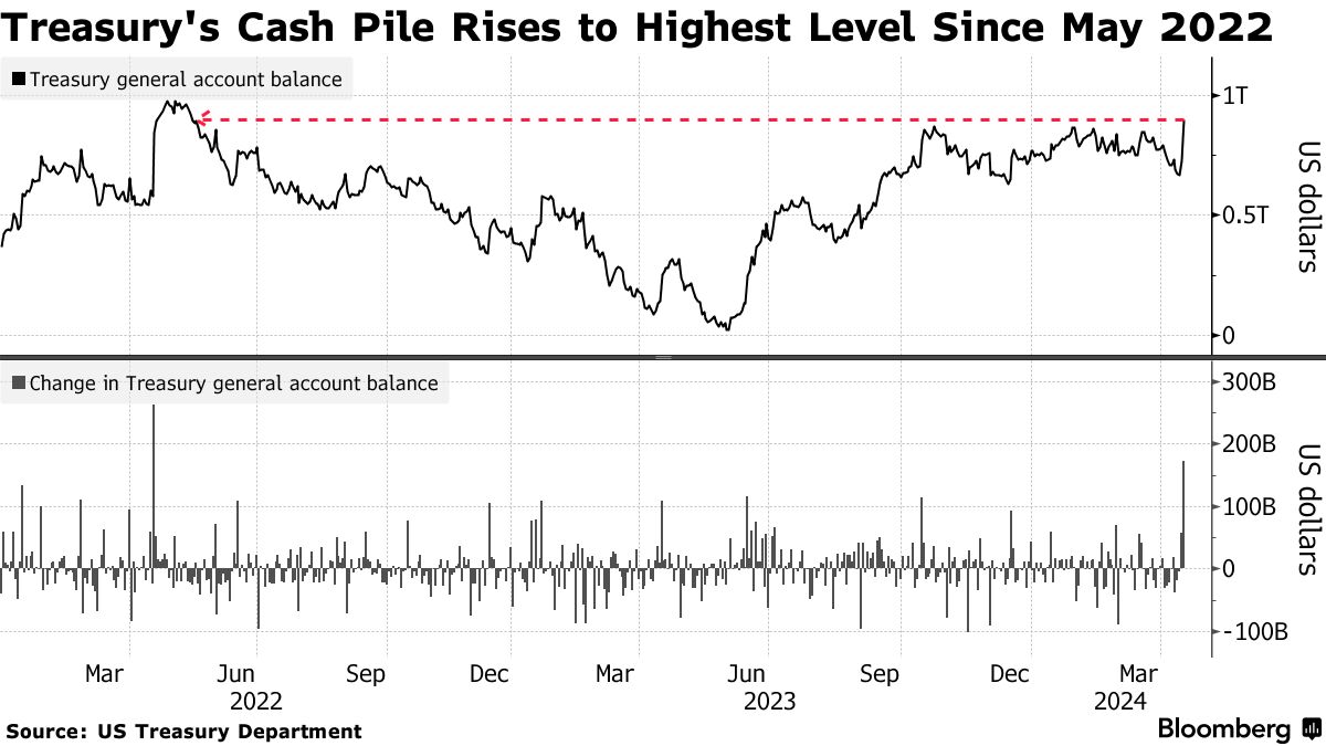 根据周二发布的数据,现金储备周一增加了1720亿美元,达到8970亿美元,创下了自2022年5月以来的最高水平。这是自2022年所得税征收截止日期以来的最大增长。