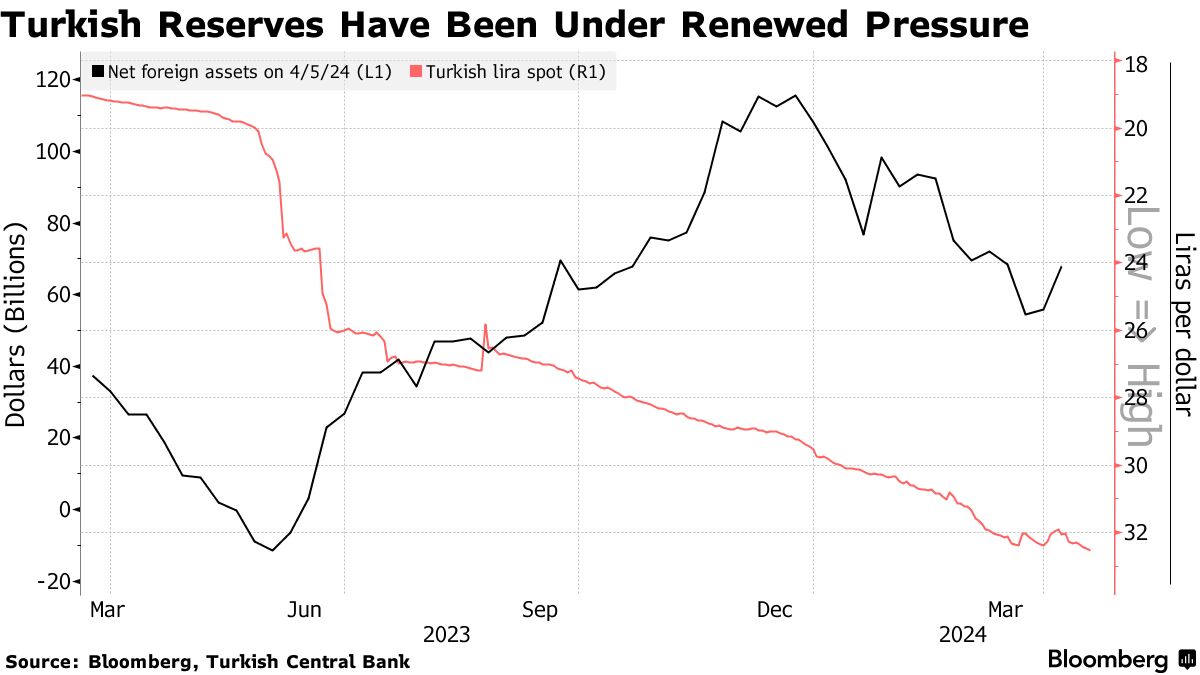但这一努力损害了本地货币,导致更多里拉注入经济,促使通胀加剧,预计到五月将超过70%。央行的毛储备自去年12月以来减少了近三分之一,逆转了去年大部分的增长。