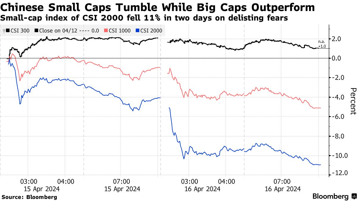 小盘股CSI 2000指数在两天内下跌了11%,因为人们担心更多公司可能面临退市风险,这是在北京新的监管框架下发生的。风险信息有限公司编制的最小的400家在岸公司指数下跌更为明显。