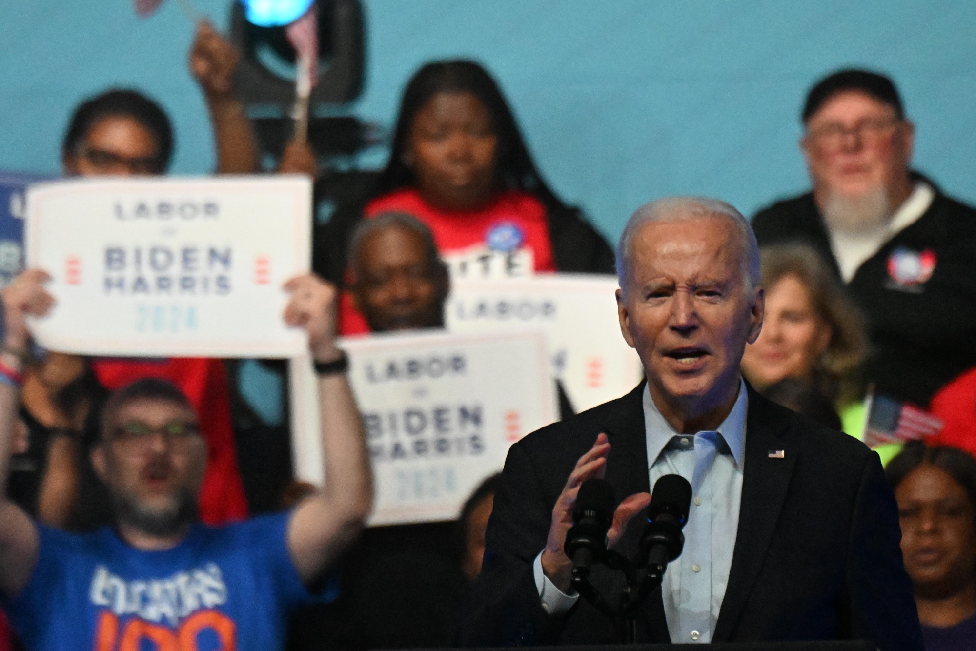 乔·拜登在六月份在宾夕法尼亚州费城向工会工人发表讲话。摄影师:马克·马克拉/盖蒂图片社