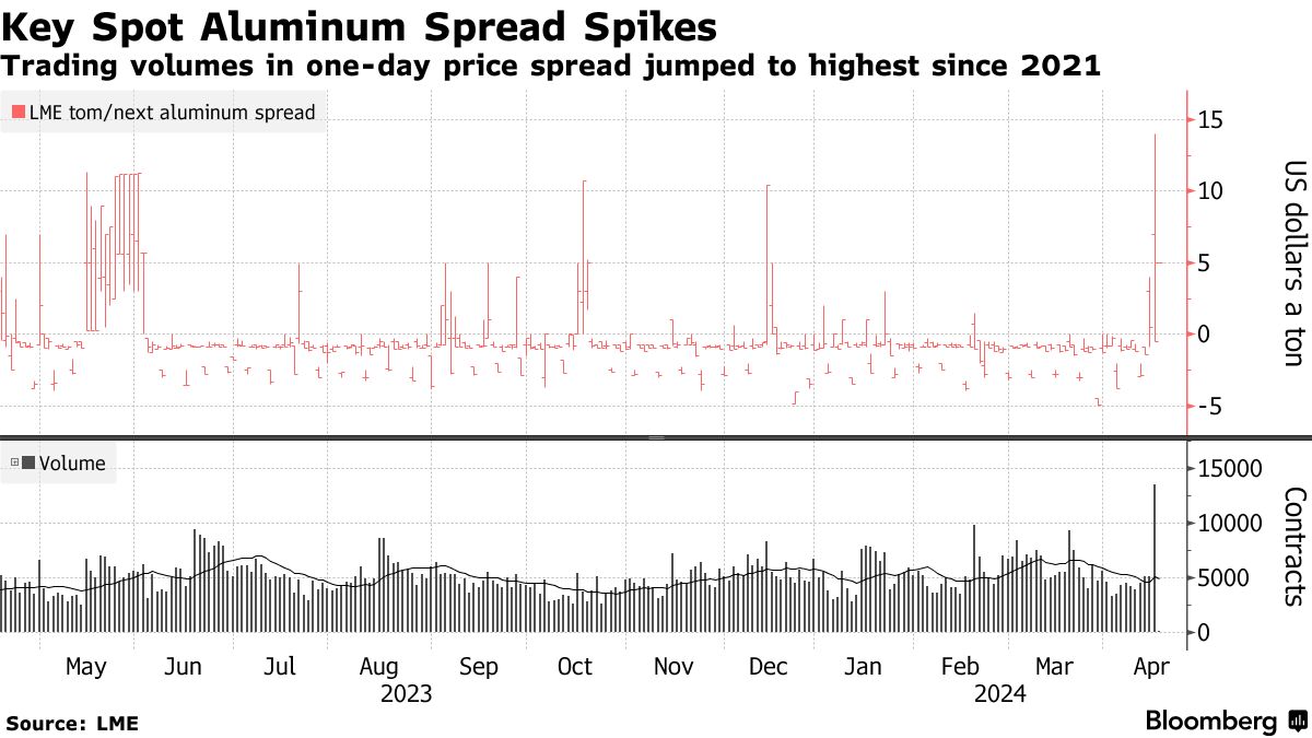 交易员正在动员的潜在证据可以在他们为获取现货金属支付的价格急剧上涨中看到。周二到期的铝合同溢价14美元,这种被称为逆回购的情况表明买家正急于获得现货供应。在这些措施宣布之前,这种价差一直在贴水交易,这是自2021年6月以来交易中价差最大的一天。
