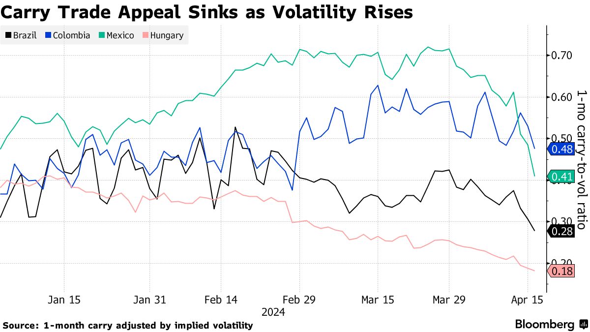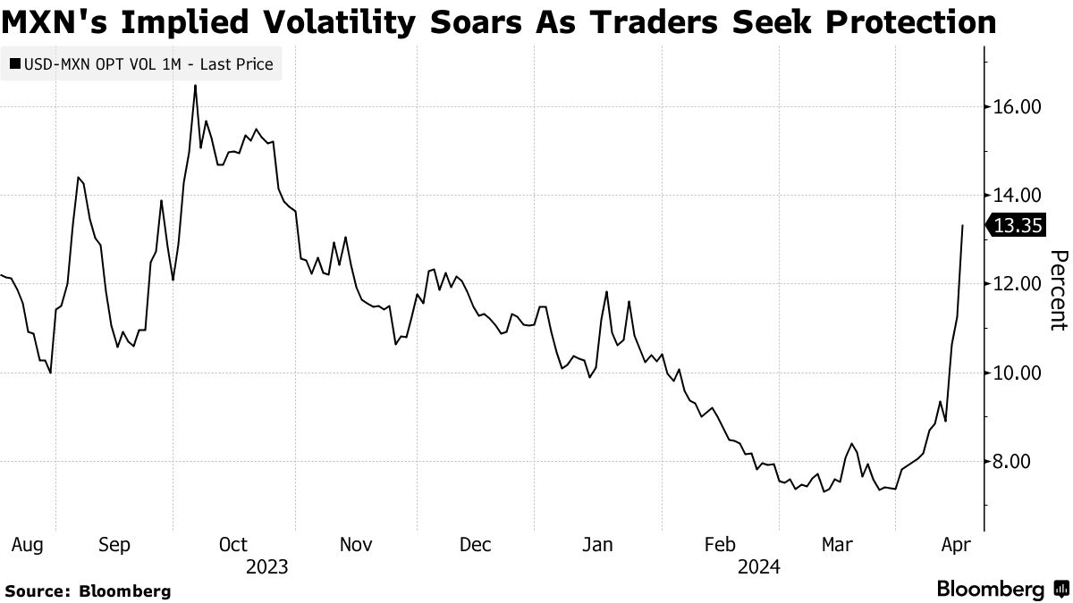 高利率、低波动性和政治稳定的组合曾吸引那些对流动性较差货币持谨慎态度的投资者投向“超级比索”。但最近美国通胀和零售销售数据强于预期以及美元大幅上涨导致波动率飙升,正在导致交易员重新审视他们的头寸。