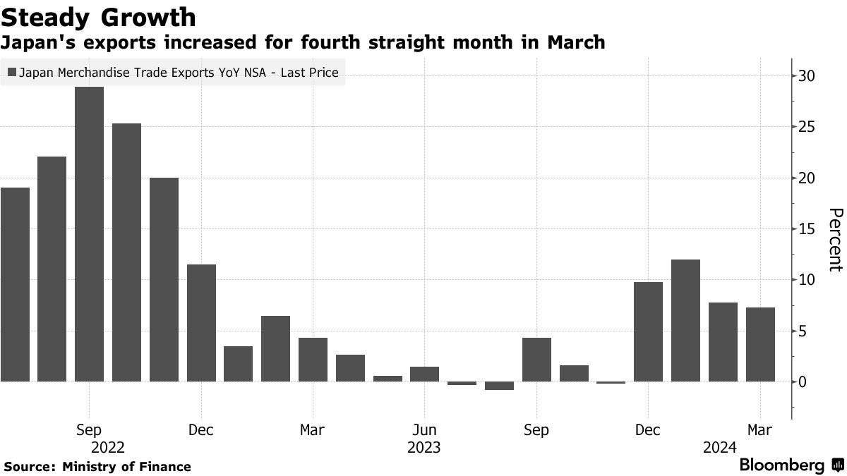 随着日元疲软提供了有利条件,以及中国需求增加,日本的出口连续第四个月增长,为经济提供了必要的支撑,因为国内消费疲软。
