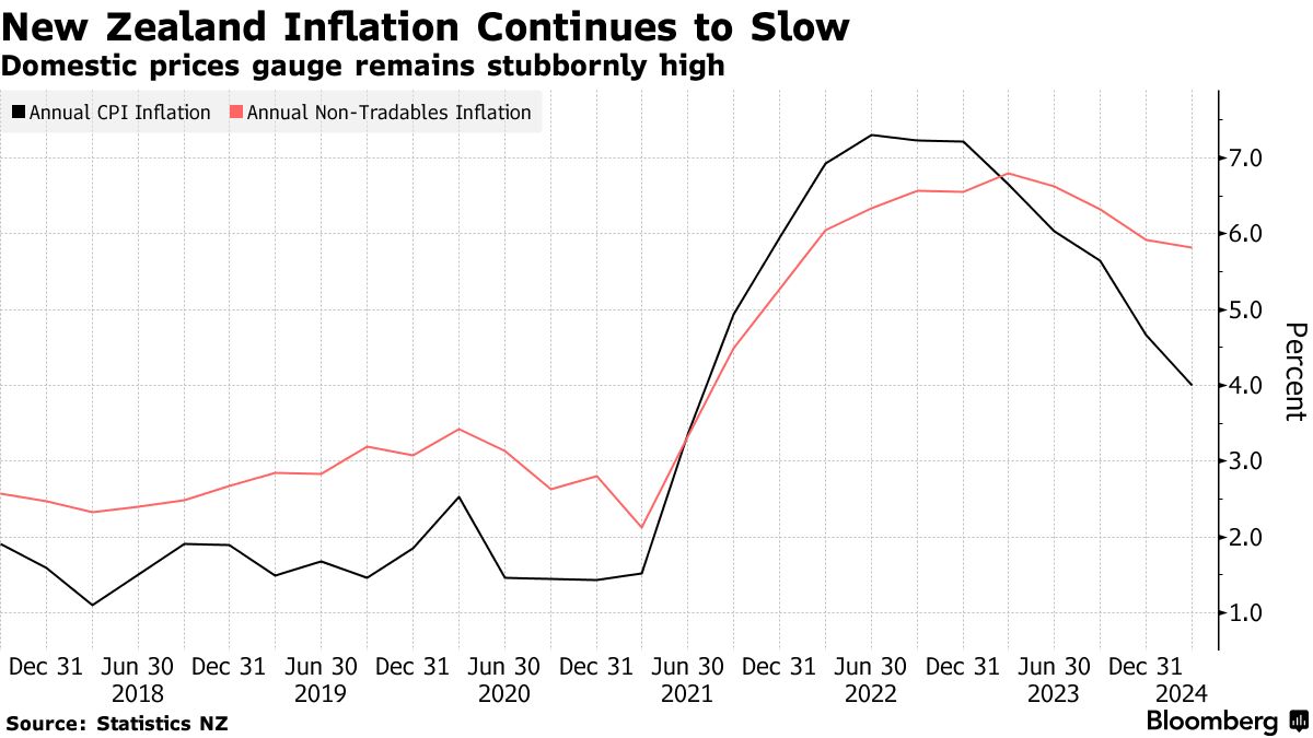 新西兰统计局周三在惠灵顿表示,年度通胀率从第四季度的4.7%降至4%。这是自2021年第二季度以来的最低水平,与经济学家的预期相符。然而,非可贸易品通胀率——一个密切关注的国内价格压力指标——几乎没有放缓,仍为5.8%。