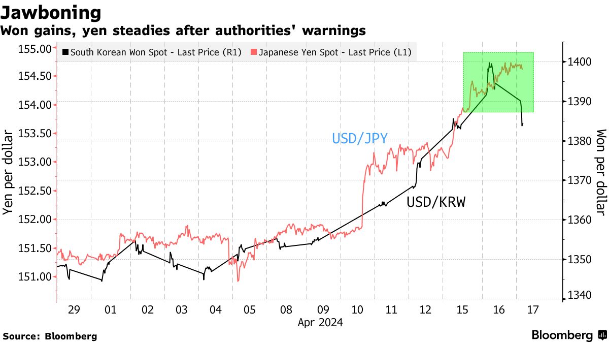 在一系列警告之后,周三早上韩元上涨了多达0.9%,至1,382.80。日元对美元的汇率基本持平,为154.66。