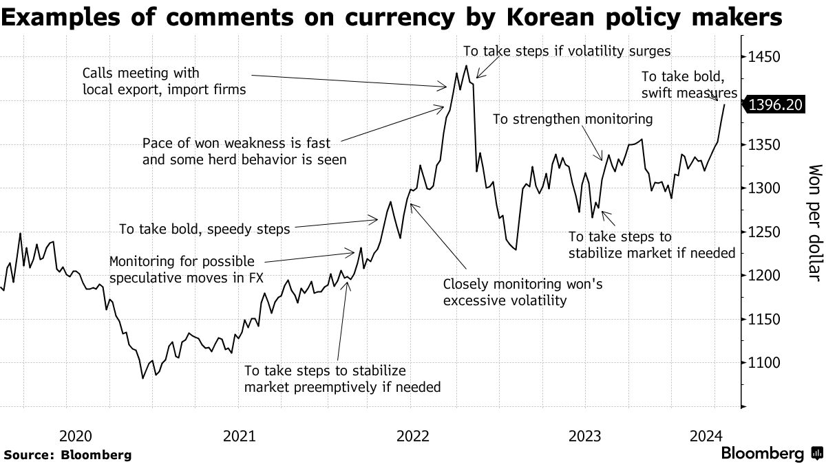 - 最罕见和最强烈的口头干预形式是当当局发布官方声明。更罕见的是,当这份声明由财政部和韩国银行的高级官员签署时,例如周二发布的那份。政府和央行发布联合声明的最后一次是在2022年6月。