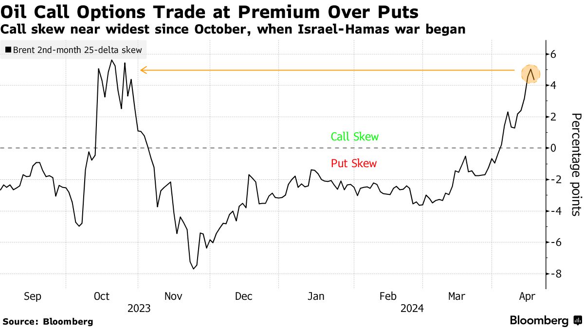 尽管头条价格波动较小,但石油期权市场发出警告。看涨期权的交易价格与看跌期权的交易价格自去年10月以来最大差距扩大 —— 当时以色列-哈马斯战争爆发 —— 看涨期权的交易量激增。交易商纷纷加入超过300万桶的期权合约,押注美国原油将在6月达到250美元/桶。