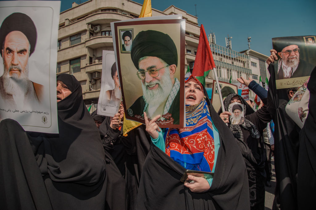 伊朗亲政府支持者在反以色列示威中举着阿亚图拉·阿里·哈梅内伊的图片,中间。