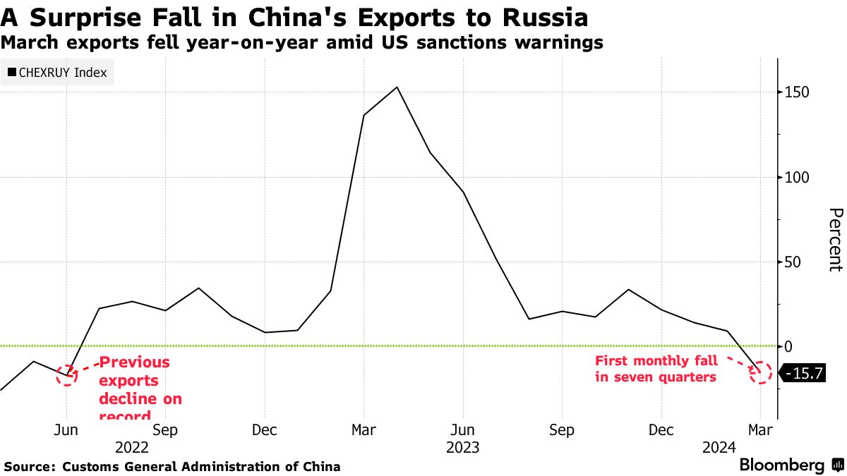 中国对俄罗斯的出口在三月份出现下滑,这是自2022年中以来的首次同比下降,与此同时,美国对北京发出了增加对俄制裁威胁的信号,如果商品支持莫斯科入侵乌克兰。