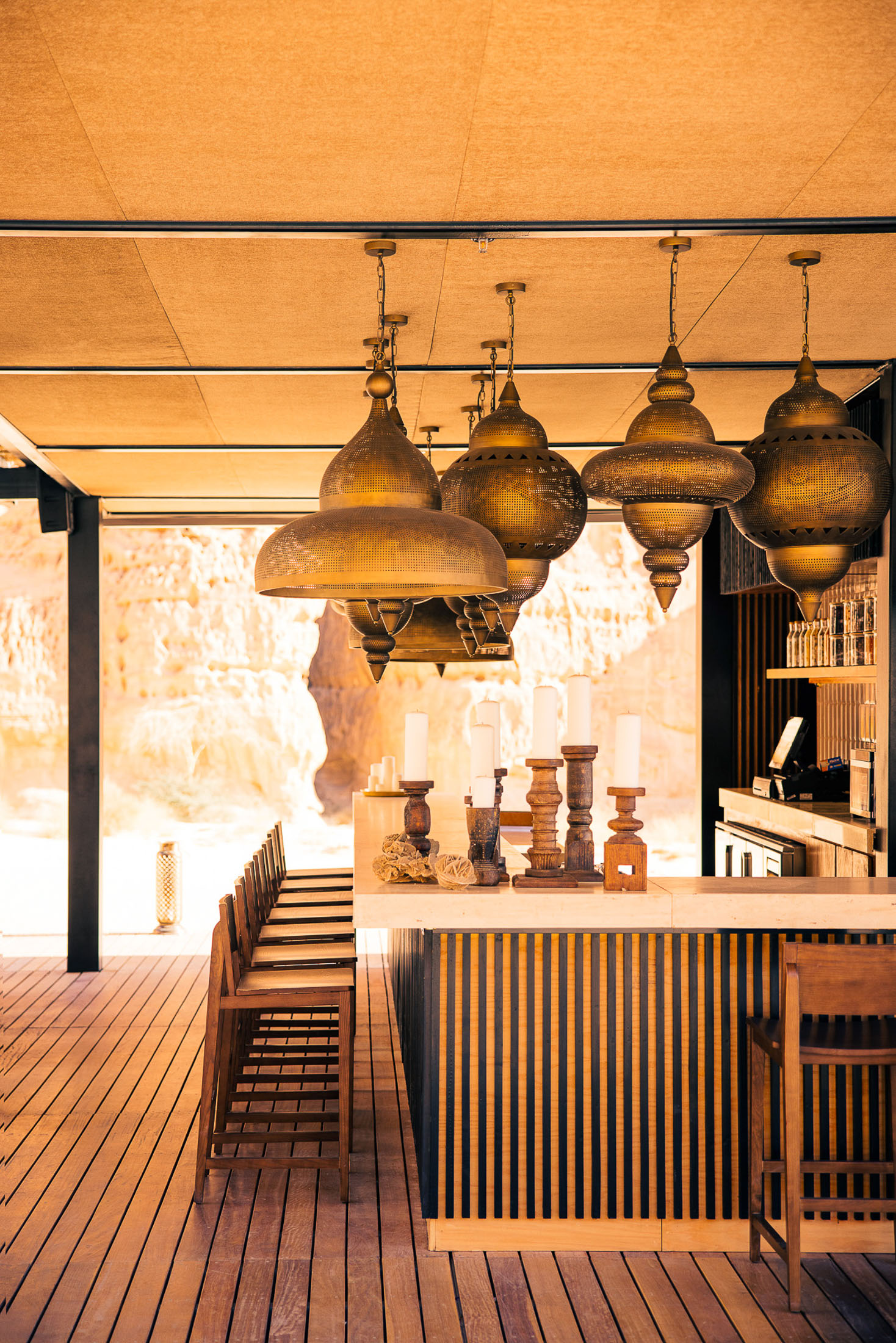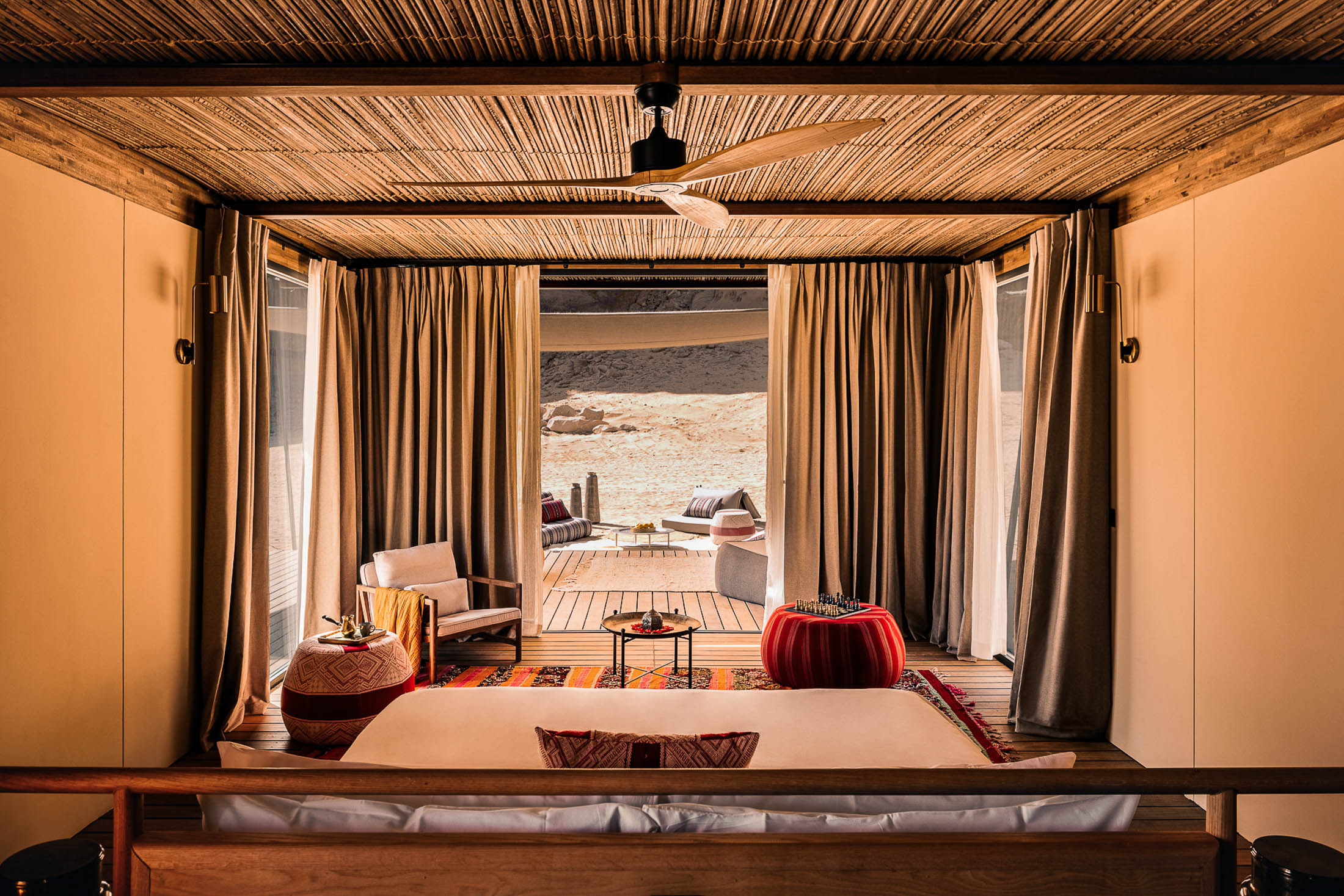 酒店建在砂岩悬崖和迷人的蓝天之间。每栋别墅都是由道德采购的有机材料建造,提供私人阳台。整个度假村的装饰包括阿拉伯设计图案、萨杜地毯和其他豪华纺织品,以及Assouline咖啡桌书籍。摄影师:Tanveer Badal### 沙漠绿洲